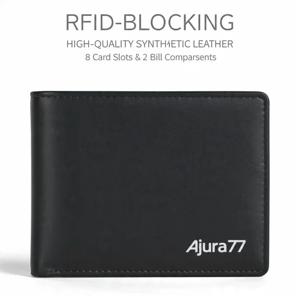 Dompet Ajura77 dari kulit sintetis berkualitas dengan slot RFID blocking. Desain slim cocok untuk pria dan wanita.