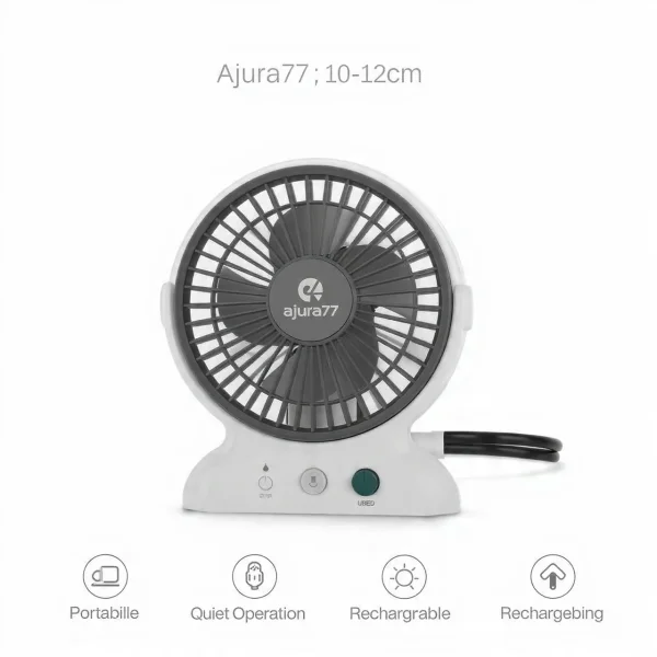 Kipas USB portable Ajura77 untuk meja kerja atau perjalanan. 3 level kecepatan, bisa rechargeable atau USB. Compact praktis.